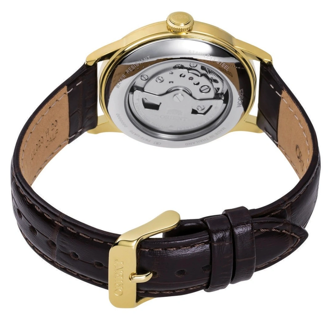 Powered by Orient’s in-house automatic Caliber F6724 movement, it offers hand-winding capability, 22 jewels, 21,600 vibrations/hour, and stable accuracy. The see-through case back allows admiration of the finely finished movement, adding a touch of sophistication for watch enthusiasts.