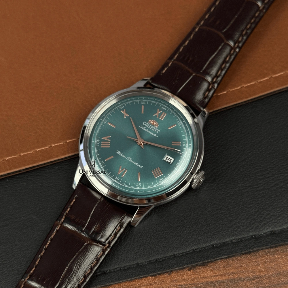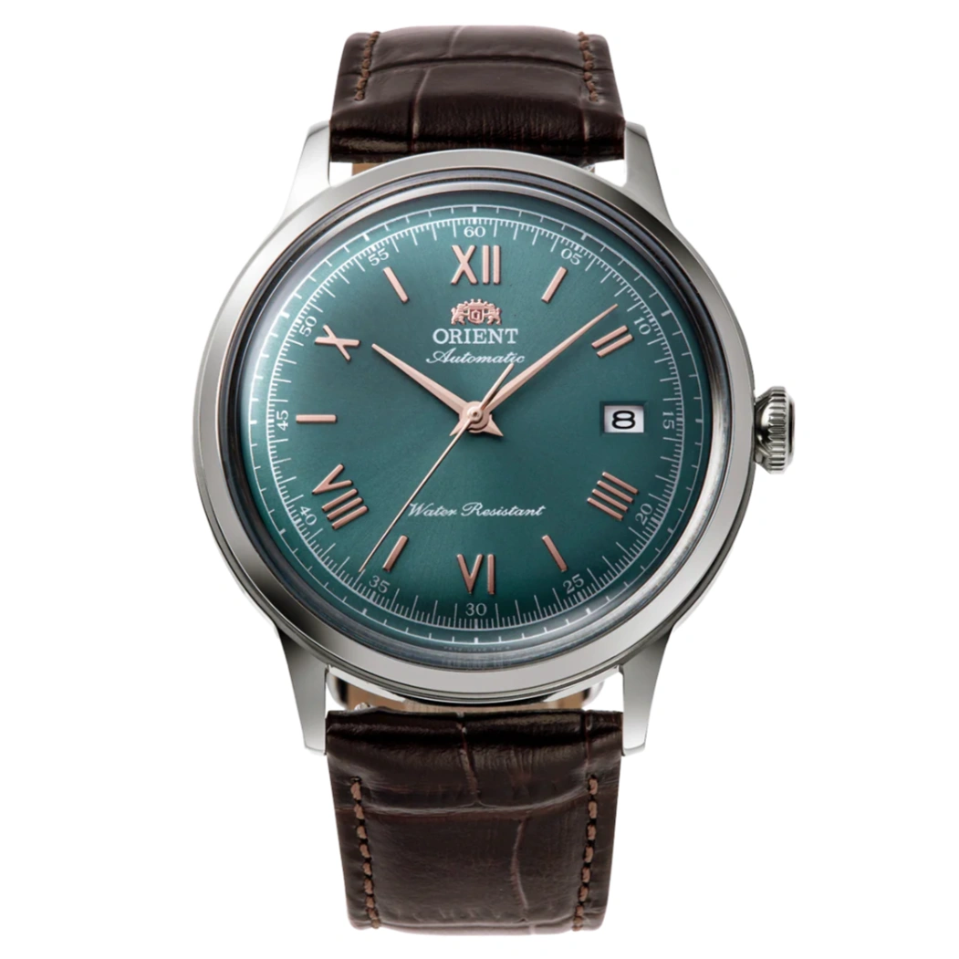 The Orient RA-AC0023E from the Classic and Simple Style collection blends timeless elegance with modern refinement. It features a curved green sunburst dial, pink gold-tone Roman numerals, and slender lugs that add sophistication to its vintage-inspired design. The domed crystal glass enhances the retro charm, while the see-through caseback reveals the precision of Orient’s in-house Caliber F6724 automatic movement. With its hand-winding capability, 22 jewels, and 40-hour power reserve, this timepiece delivers reliable performance wrapped in classic beauty.
