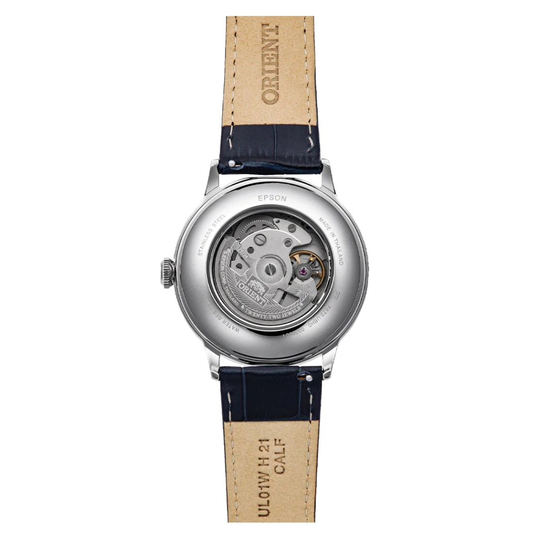 The Orient RA-AC0024L from the Classic and Simple Style collection combines timeless design with contemporary elegance. Its navy blue sunburst dial, silver-tone Roman numerals, and slender lugs create a refined aesthetic, while the domed crystal glass adds a vintage-inspired touch. The see-through caseback showcases the precise Orient Caliber F6724 automatic movement, complete with hand-winding capability, 22 jewels, and 40-hour power reserve, making it a sophisticated choice for everyday wear or formal occasions.