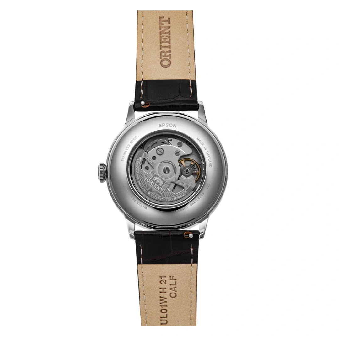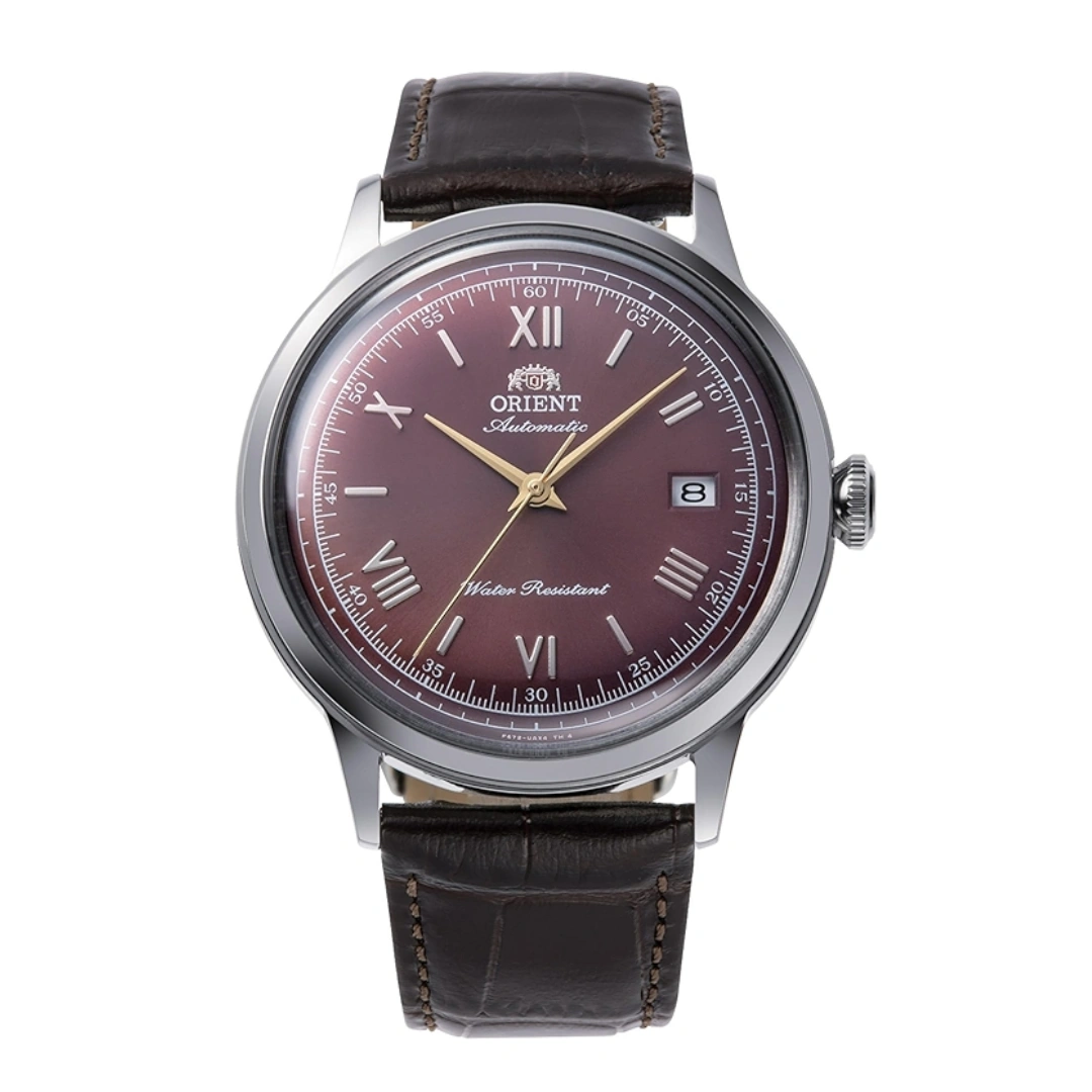 The Orient RA-AC0026R from the Classic and Simple Style collection combines timeless elegance with modern sophistication. Featuring a bordeaux sunburst dial, silver-tone Roman numerals, and gold-tone hands, this watch balances classic design with subtle luxury. Its curved dial, domed crystal glass, and slender lugs enhance the vintage appeal, while the see-through caseback displays the Orient Caliber F6724 automatic movement with hand-winding capability, 22 jewels, and a 40-hour power reserve, making it a perfect choice for everyday wear or formal occasions.