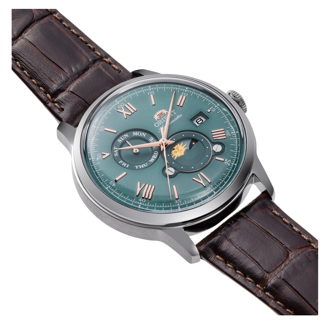 The Orient RA-AK0805E from the Classic and Simple Style collection combines elegance with practical functionality. Featuring a sunburst green dial, this watch includes a day and night display with rotating sun and moon disk and a day-of-the-week indicator with a dedicated hand, creating a visually engaging and informative dial. The asymmetric placement of the displays adds a unique design element, making it stand out as a sophisticated timepiece.