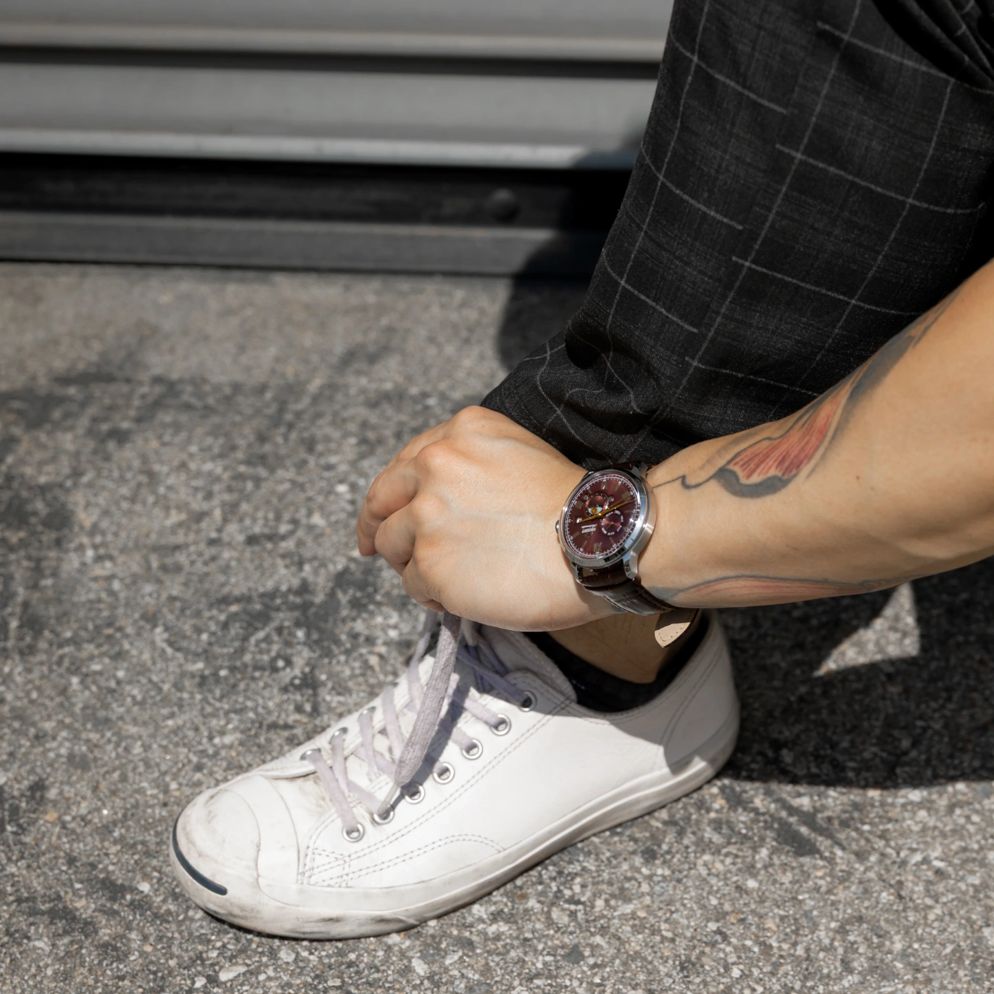 Dial Color: Bordeaux sunburst with day/night sun and moon display and day-of-week hand