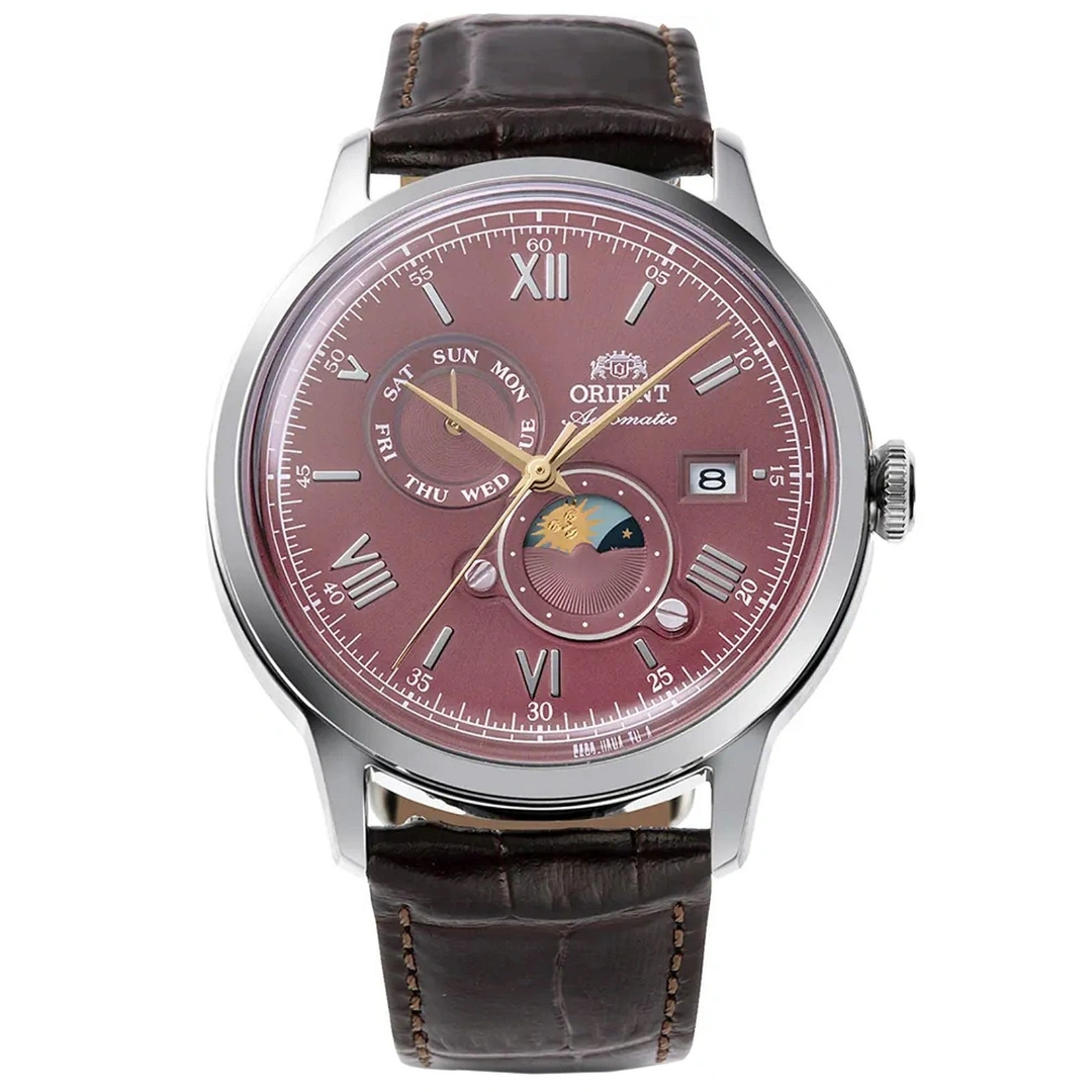 The Orient RA-AK0807R from the Classic and Simple Style collection blends elegance and functionality. Featuring a sunburst bordeaux dial, this watch includes a day and night display with rotating sun and moon disk and a day-of-the-week indicator with a dedicated hand, creating a unique and visually engaging dial. The asymmetric layout of the displays adds a distinctive design element, making this timepiece a sophisticated statement for daily wear or formal occasions.