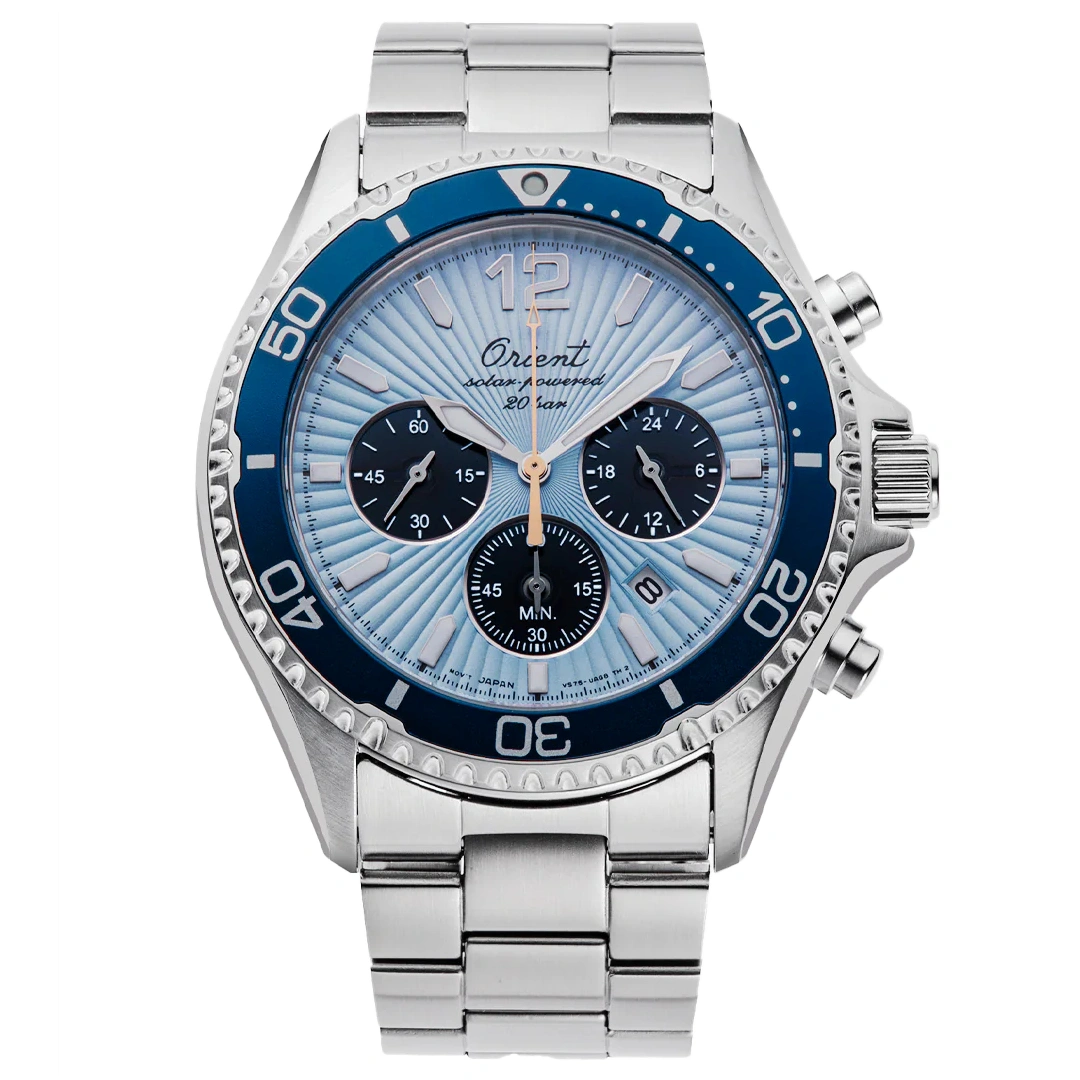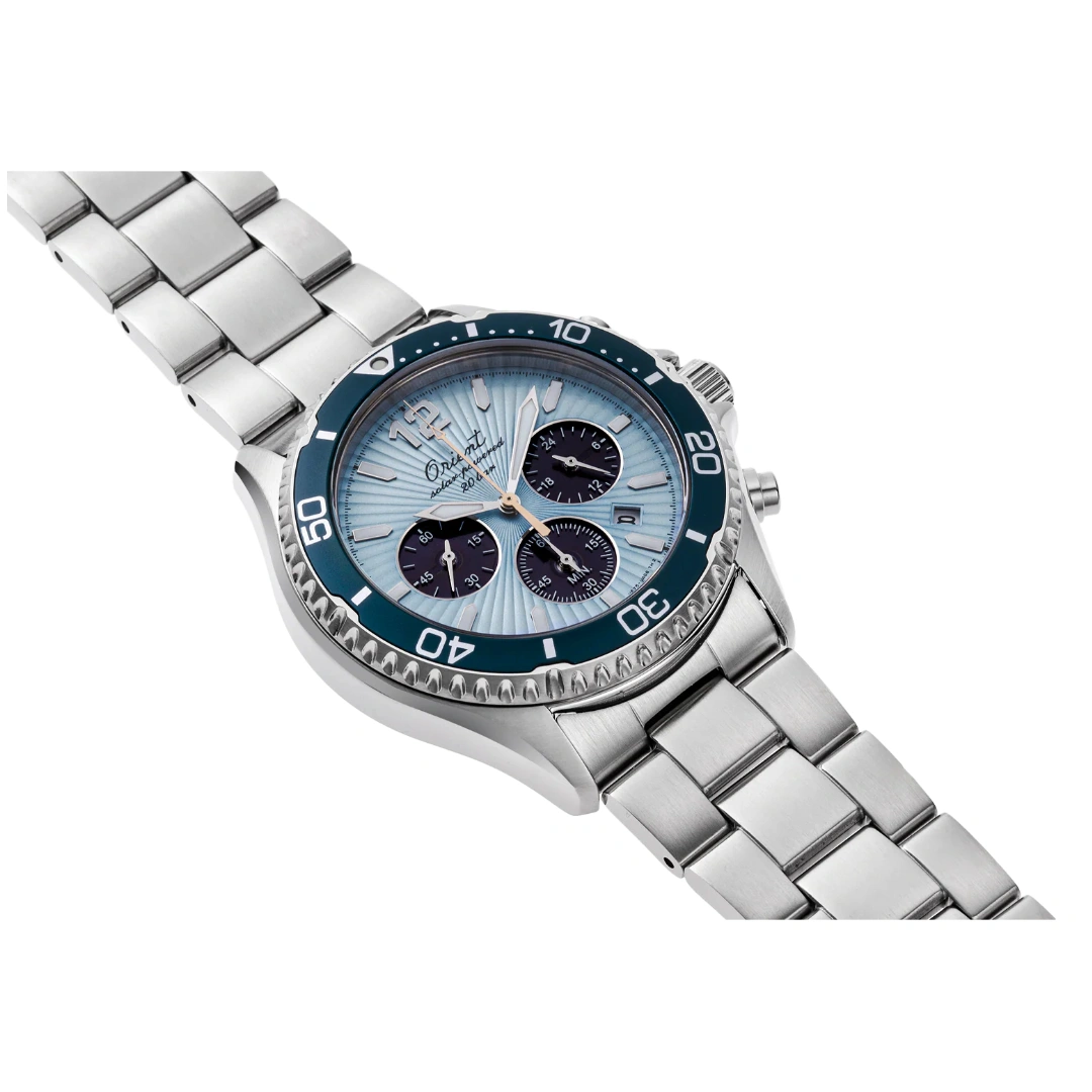 The Orient RA-TX0210L captures the feeling of sunny days, clear skies, and gentle sea breezes. Featuring a sky-blue sunburst dial, sunlight-inspired chronograph second hand, and vintage 1950s cursive Orient logo, this limited-edition watch combines sporty design with collector’s appeal. The screw-down crown and screw case-back provide 20-bar water resistance, and the case-back is engraved with “Orient Since 1950 – 75th Anniversary” and the individual serial number, making it one of 1,000 pieces worldwide.