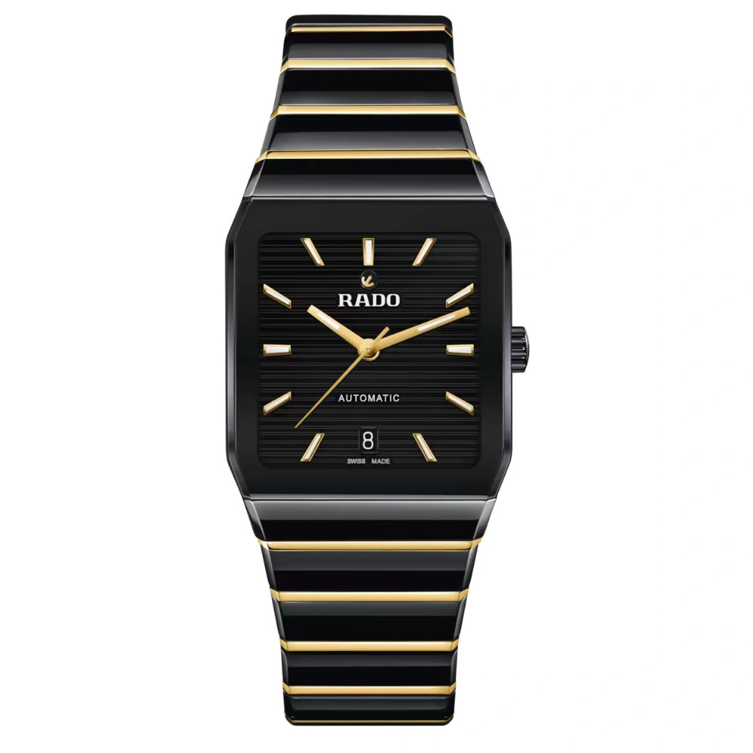 At the heart of the watch, the automatic R766 calibre with 21 jewels delivers precise timekeeping and a robust 72-hour power reserve. Equipped with a Nivachron™ hairspring and finely regulated in five positions, this movement ensures accuracy and reliability. The polished black high-tech ceramic and yellow gold PVD-coated bracelet, secured by a brushed stainless steel 3-fold clasp, offers both comfort and elegance. With water resistance up to 50 meters, this model perfectly combines Rado’s signature innovation, Swiss craftsmanship, and striking design.