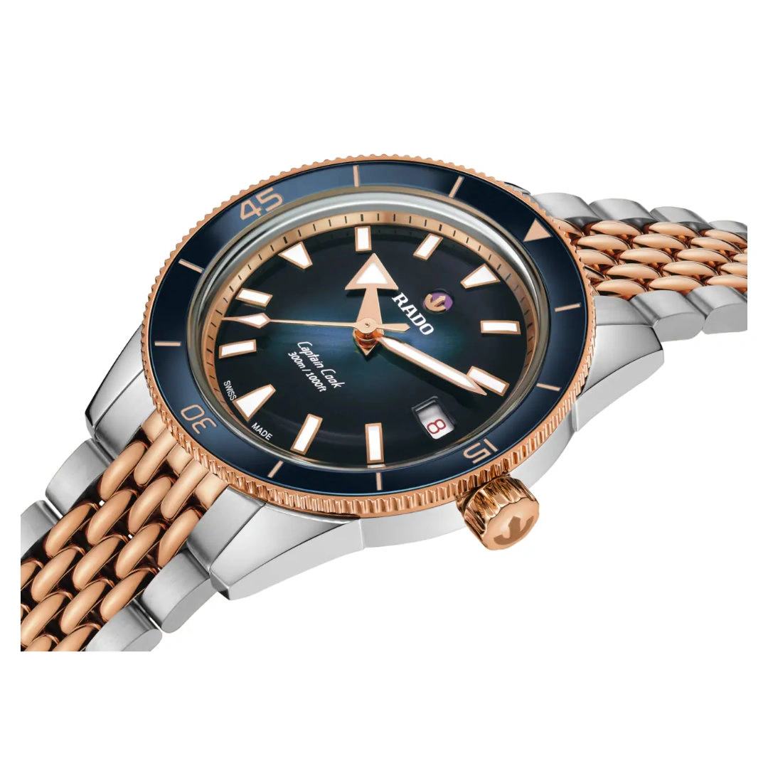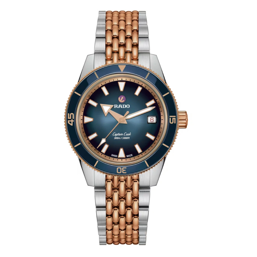Inspired by the original 1962 Captain Cook, this modern edition preserves the spirit of a classic dive watch while elevating it with contemporary materials and refined details. The 39 mm stainless steel case is paired with a striking black-to-blue gradient dial, while rose-gold-coloured accents on the bezel and crown (PVD-coated) add warmth and sophistication to the vintage-inspired design. Super-LumiNova® coated hands and indexes ensure excellent readability in all lighting conditions.