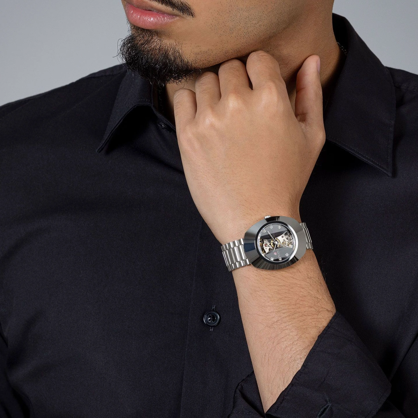 The Rado DiaStar Original Open Heart, reference number R12063103, is a 35 mm unisex watch that showcases Swiss precision and high-tech design. Its oval stainless-steel case is paired with a scratch-resistant sapphire crystal, while the skeleton dial reveals the intricate mechanics of the R764 automatic movement. Baton hands treated with luminescent coating and gemstone indexes provide elegant readability and a sophisticated aesthetic.