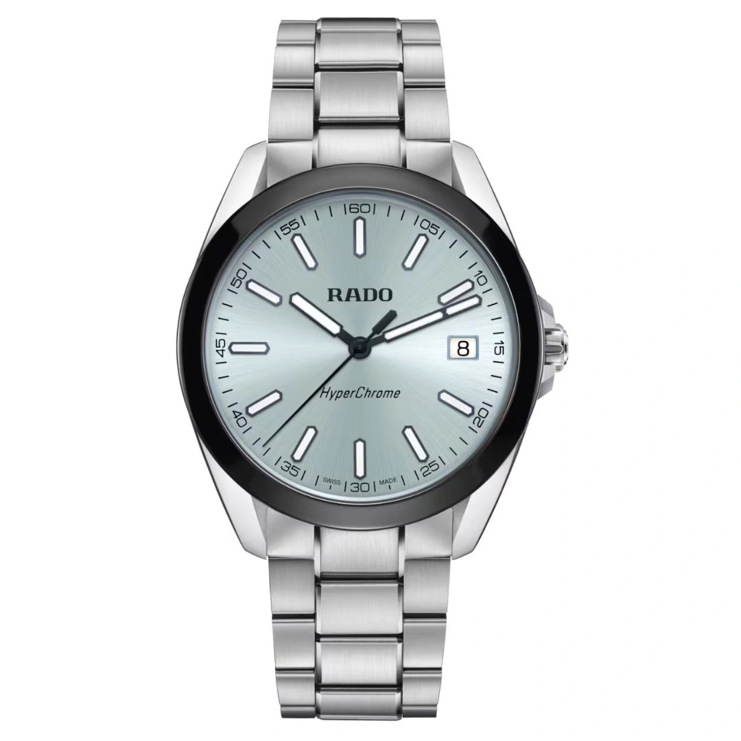 The Rado HyperChrome Quartz – R32280213 combines contemporary design with technical precision. Its 41.5 mm polished and brushed stainless steel case is complemented by a black high-tech ceramic bezel and a curved sapphire crystal with inner anti-reflective coating, providing excellent durability and crystal-clear legibility. The ice blue sunray dial contrasts elegantly with black PVD-coated hands and indices, all treated with Super-LumiNova® for optimal readability. A date window at 3 o’clock completes the balanced design, making it ideal for both everyday wear and formal occasions.