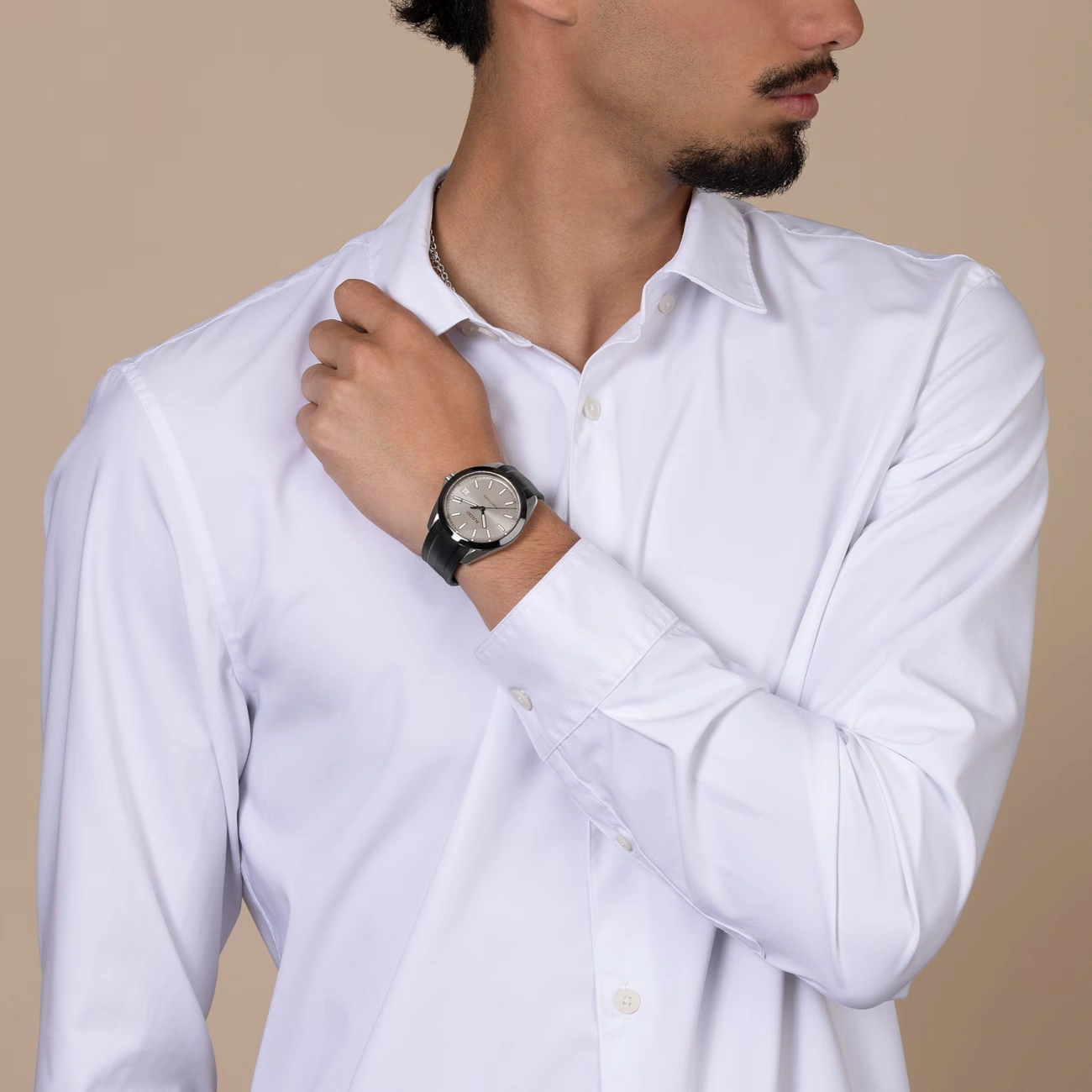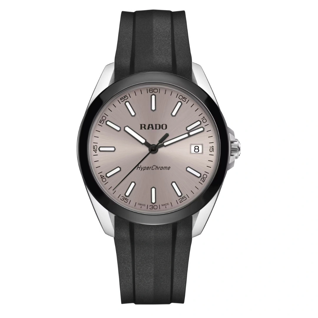 The Rado HyperChrome Quartz is a contemporary timepiece that fuses bold design with Swiss precision. Its 41.5 mm polished and brushed stainless steel case is complemented by a black high-tech ceramic bezel and topped with a curved sapphire crystal, providing scratch resistance and exceptional legibility. The rhodium sunray dial features black PVD-coated hands and indices with Super-LumiNova® for clear visibility, while a discreet date window at 3 o’clock adds functionality. The watch combines strength, elegance, and modern styling in one enduring package.