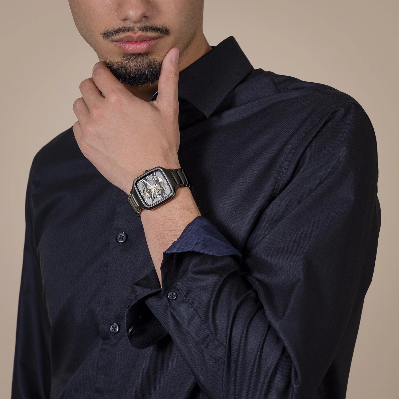 The Rado True Square Automatic Skeleton, reference number R27197152, is a 38 mm timepiece that masterfully blends advanced high-tech materials with fine craftsmanship. Its matte black high-tech ceramic monobloc case provides both strength and lightweight comfort, while the sapphire crystal with anti-reflective coating ensures clear legibility. The skeleton dial offers a fascinating view of the movement’s intricate mechanics, making it a true conversation piece for watch enthusiasts.