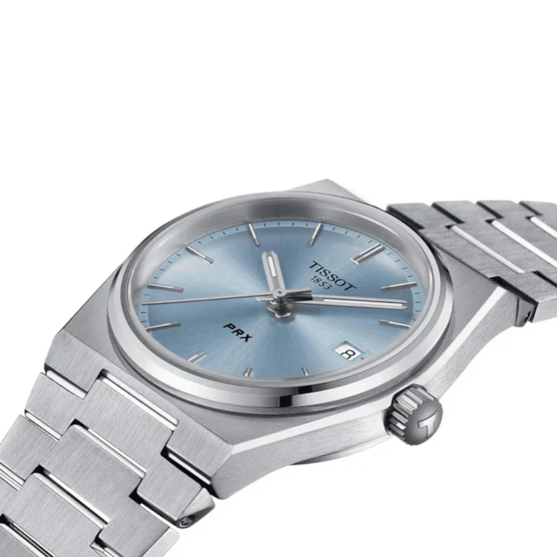 Born in 1978 and revived for modern design enthusiasts, the Tissot PRX 35mm celebrates iconic style with a sleek, contemporary edge. Its slim tonneau-shaped 316L stainless steel case pairs perfectly with a light blue dial, creating a fresh yet timeless look. The integrated bracelet design and clean lines make it an unmistakable statement of refined Swiss design heritage.