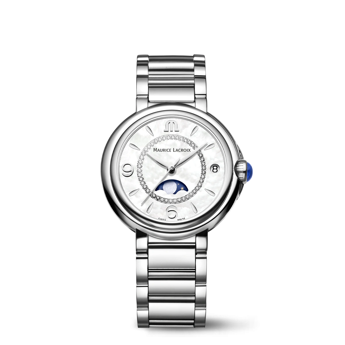 The FIABA Moonphase elegantly combines functionality, glamour, and style. Designed for today’s sophisticated woman, this timepiece features a white mother-of-pearl dial with rhodium-plated Arabic numerals and indexes, paired with rhodium-plated hands. The moonphase complication at 6 o’clock adds a poetic touch, while the date function at 3 o’clock ensures practical daily use. Encased in polished stainless steel and complemented by a matching bracelet, this watch is the perfect accessory for refined elegance and understated luxury.