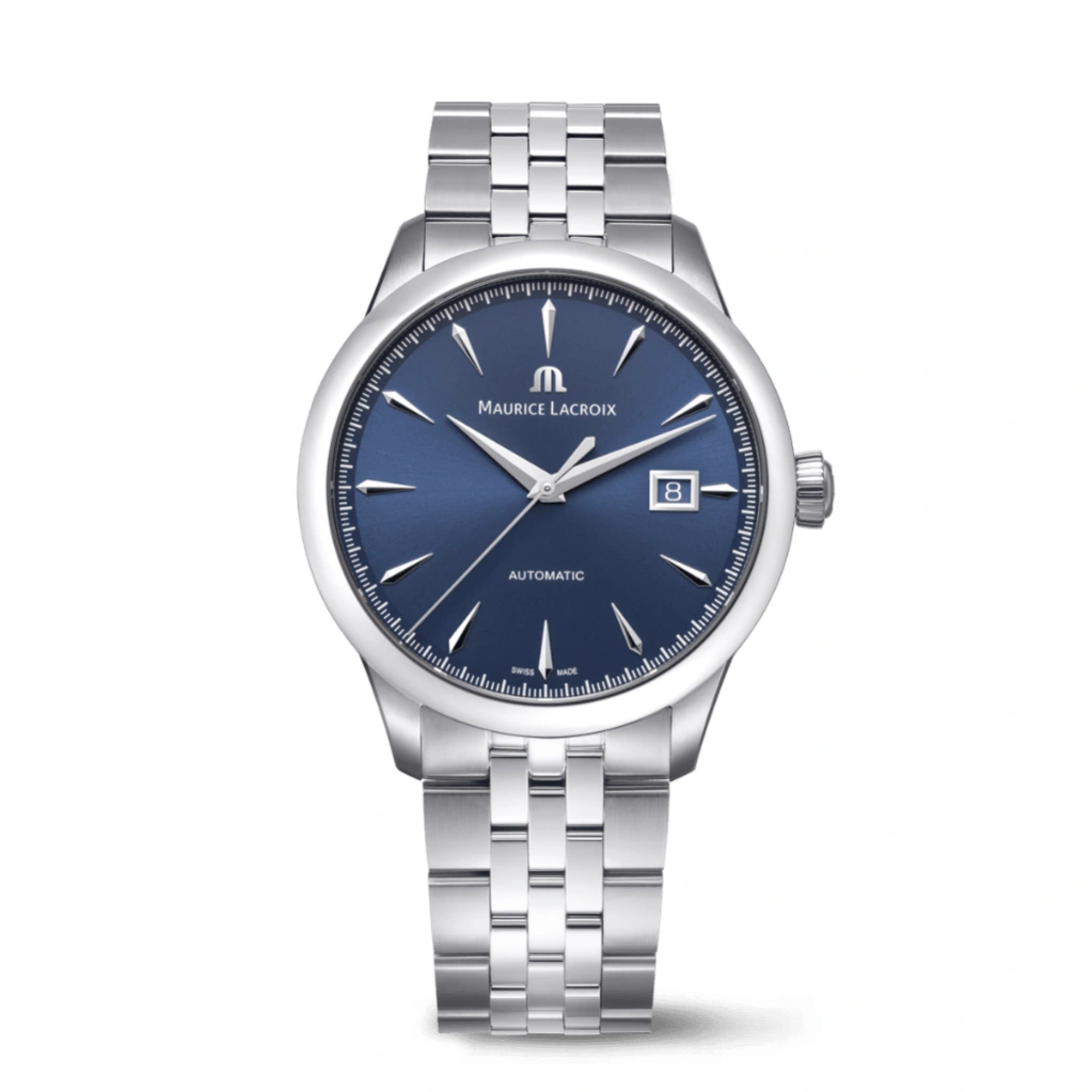 Endowed with elegant styling and sleek proportions, the 1975 collection exudes a vintage vibe while simultaneously promising enduring appeal. Clean, refined, and delivering high perceived value, this collection may be new, but it remains packed with familiar Maurice Lacroix characteristics. From the brushed and polished stainless steel case to the sun-brushed blue dial with silver powder printing, every detail reflects meticulous craftsmanship. Featuring an automatic ML115 movement visible through the open case back, this timepiece combines classic elegance with mechanical sophistication. The stainless steel bracelet and easy-change system enhance its versatility, making it suitable for both formal and casual occasions.