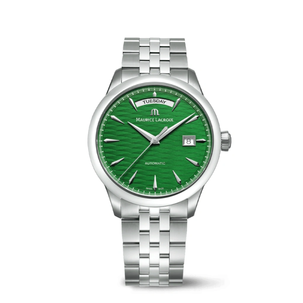 Endowed with elegant styling and sleek proportions, the 1975 collection exudes a vintage vibe while simultaneously promising enduring appeal. Clean, refined, and delivering high perceived value, this limited-edition model (only 500 pieces) remains packed with familiar Maurice Lacroix characteristics. From the brushed and polished stainless steel case to the green dial featuring the signature Jura waves motif, every detail reflects meticulous craftsmanship. Featuring an automatic ML168 movement with day and date functions, this timepiece combines classic elegance with mechanical sophistication. The stainless steel bracelet and easy-change system enhance its versatility, making it perfect for both formal and casual occasions.