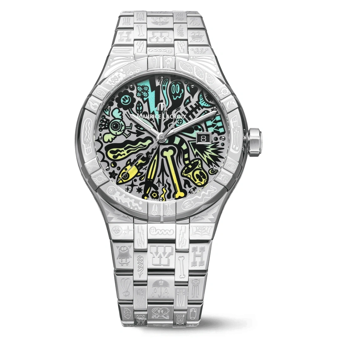 Urban-inspired design meets artistic expression in the Maurice Lacroix AIKON Automatic Wotto Limited Edition. Featuring a distinctive engraved case and a bold dial designed by Wotto, this timepiece stands out with its playful contrasts, vibrant gradient tones, and unique visual identity. Limited to just 1000 pieces worldwide, it offers exclusivity alongside the iconic AIKON aesthetic, including the signature six-claw bezel and contemporary stainless-steel construction.