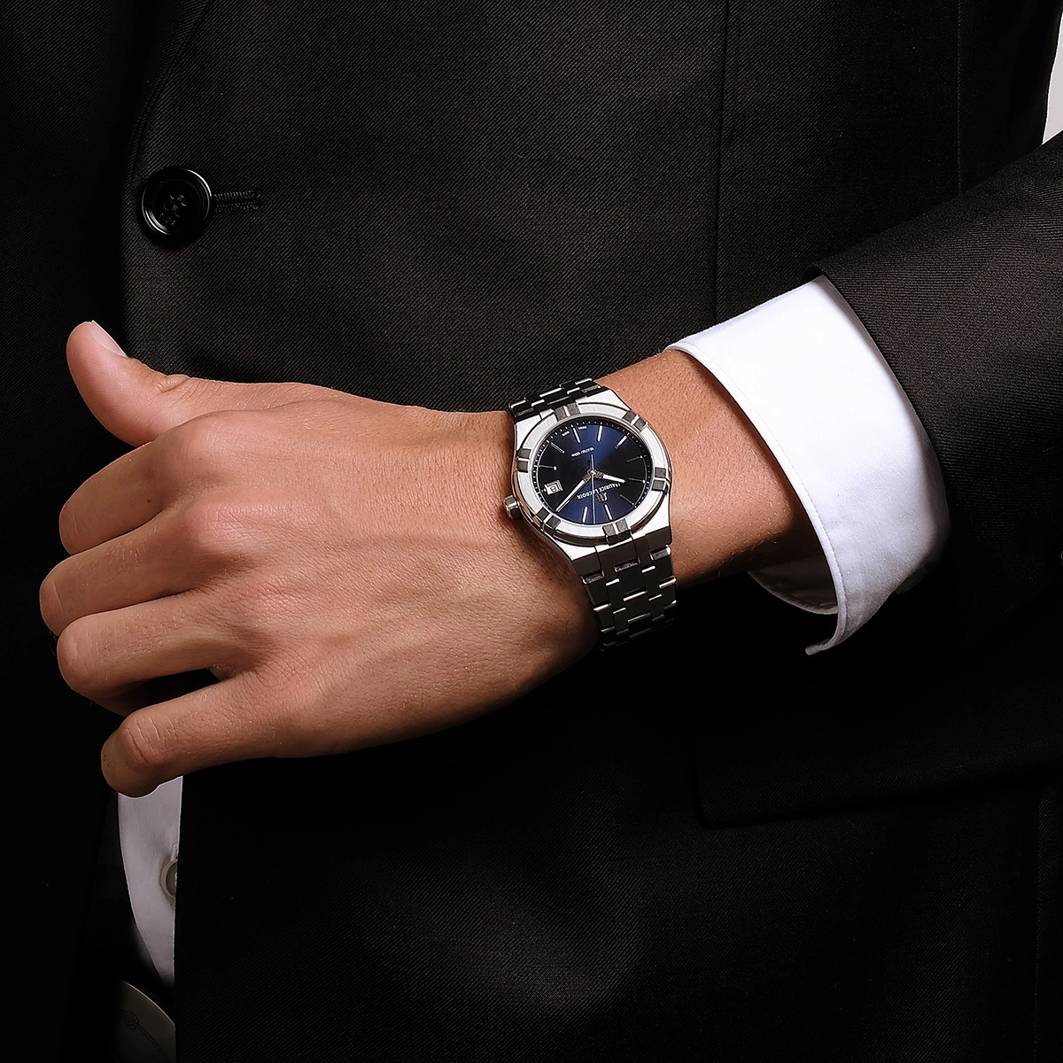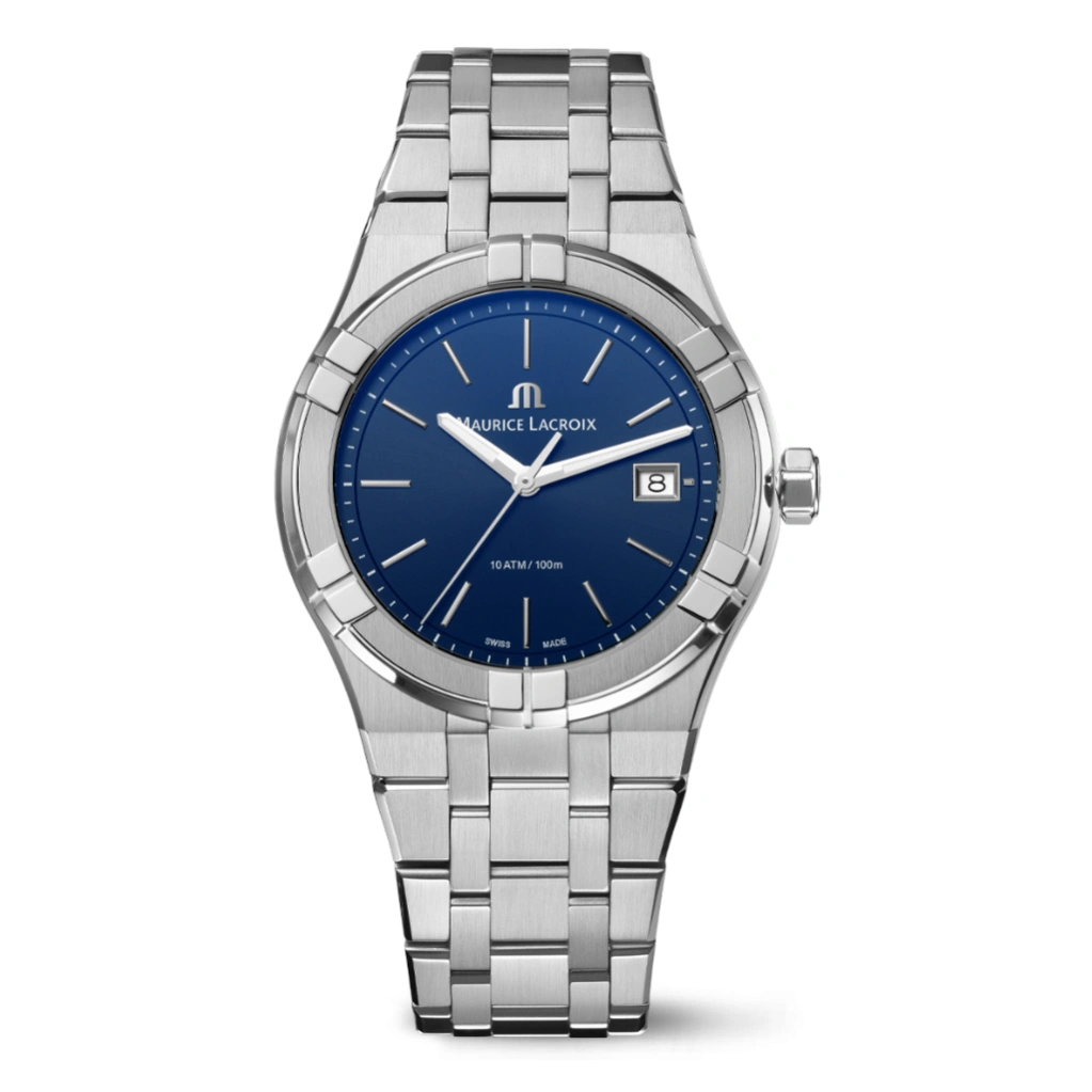 Inspired by the iconic Calypso of the 90s, the AIKON has become an icon in its own right. Its design embraces bold, urban styling while masterfully playing with contrasts. Like all Maurice Lacroix watches, it unites Swiss craftsmanship with high perceived value, creating a versatile timepiece suitable for both daily wear and special occasions. The blue sun-brushed dial with silver powder printing and rhodium-plated accents adds a modern, sophisticated touch.