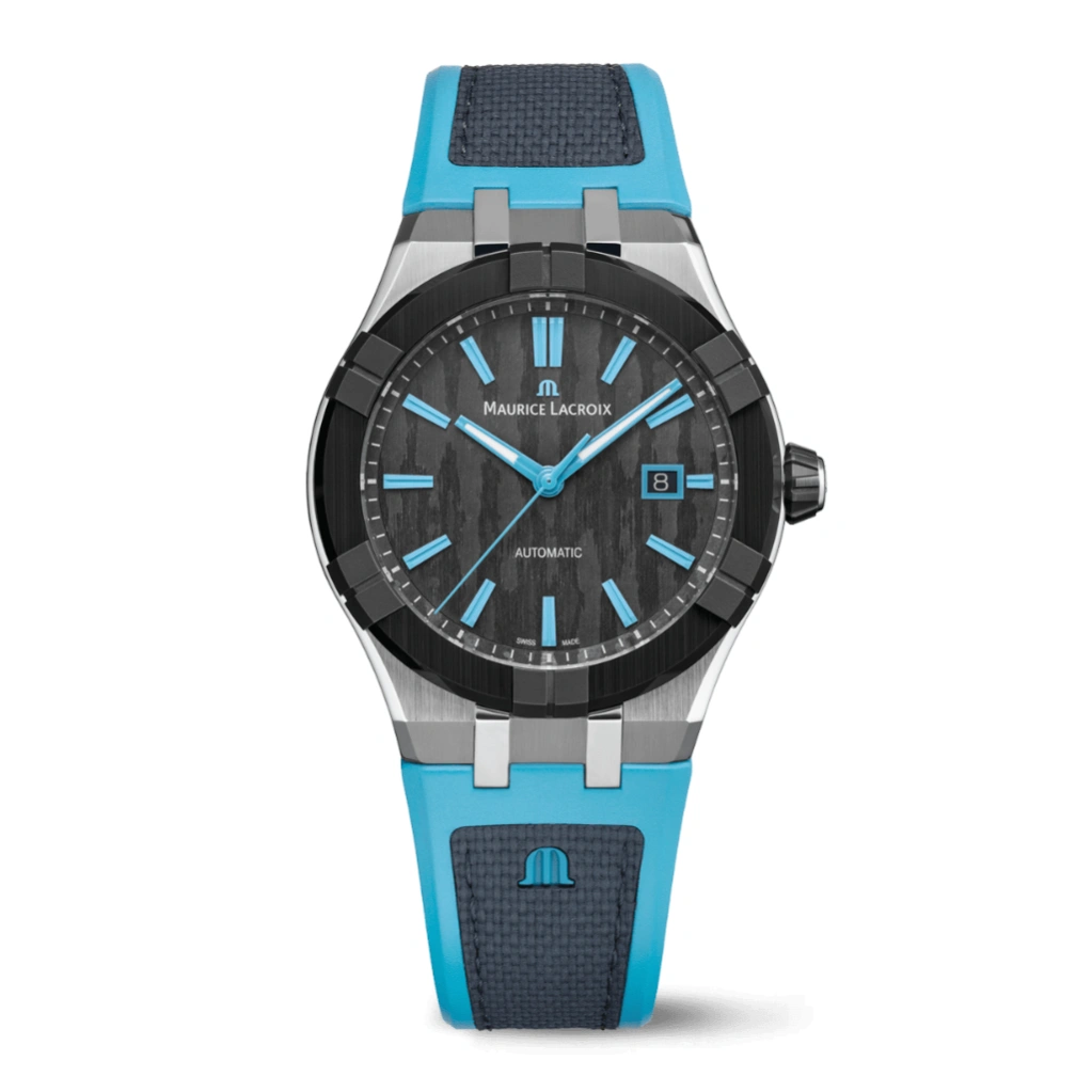 Bracelet/Strap: Turquoise and black bi-rubber strap with imitation nylon-textured rubber, featuring the Maurice Lacroix 'M' logo