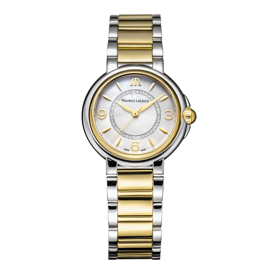 The FIABA celebrates elegance, delicacy, and modern femininity. This ladies’ watch features a white mother-of-pearl dial adorned with 46 diamonds, radiating sophistication and charm. Yellow gold-plated Arabic numerals and indexes, along with yellow gold-plated hands with white super-luminova, provide both style and legibility. Encased in polished two-tone stainless steel and yellow gold PVD plating with a specially engraved case back, this timepiece is water-resistant up to 5 ATM. The matching two-tone bracelet completes the luxurious yet accessible look, making it perfect for evening wear or special occasions.