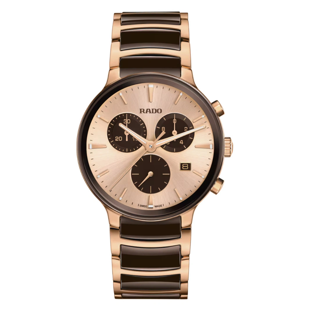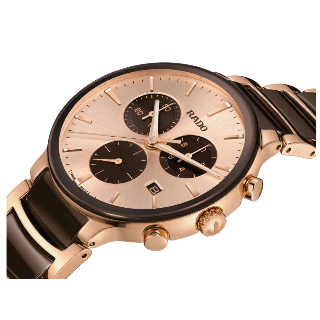 The Rado Centrix Chronograph combines refined elegance with Swiss precision in a stunning rose gold-accented design. The 41 mm stainless steel case, treated with a rose gold-coloured PVD coating, is paired with a curved sapphire crystal featuring anti-reflective coating on both sides for exceptional clarity. The black sunray dial is enhanced with rose gold-coloured applied indexes and white Super-LumiNova®, creating a sophisticated, high-contrast look that is both stylish and highly legible.