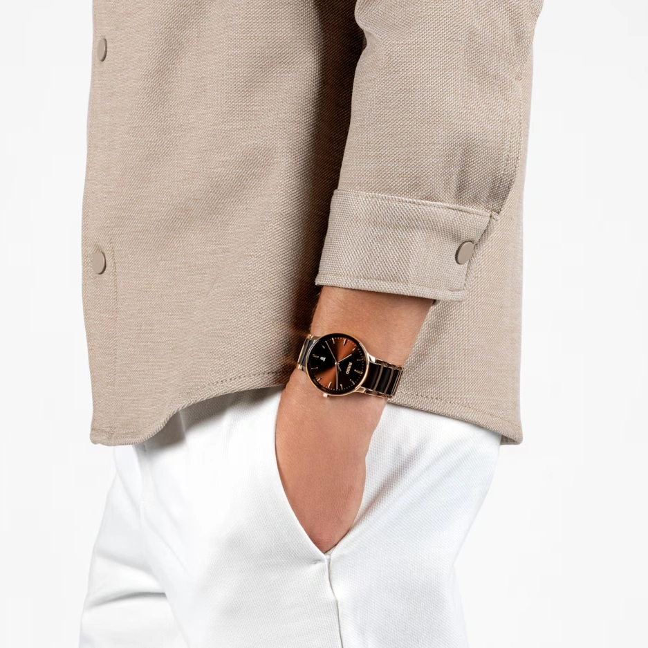 The Rado Centrix Quartz redefines classic elegance with a modern twist. Its 39.5 mm stainless steel case, treated with a rose gold-coloured PVD coating, is paired with a rounded sapphire crystal that extends to the edges, creating a seamless, flowing design. The brown sunray dial, featuring rose gold-coloured applied indexes and hands, adds warmth and sophistication, while the polished bracelet with brown high-tech ceramic middle links completes the luxurious aesthetic.