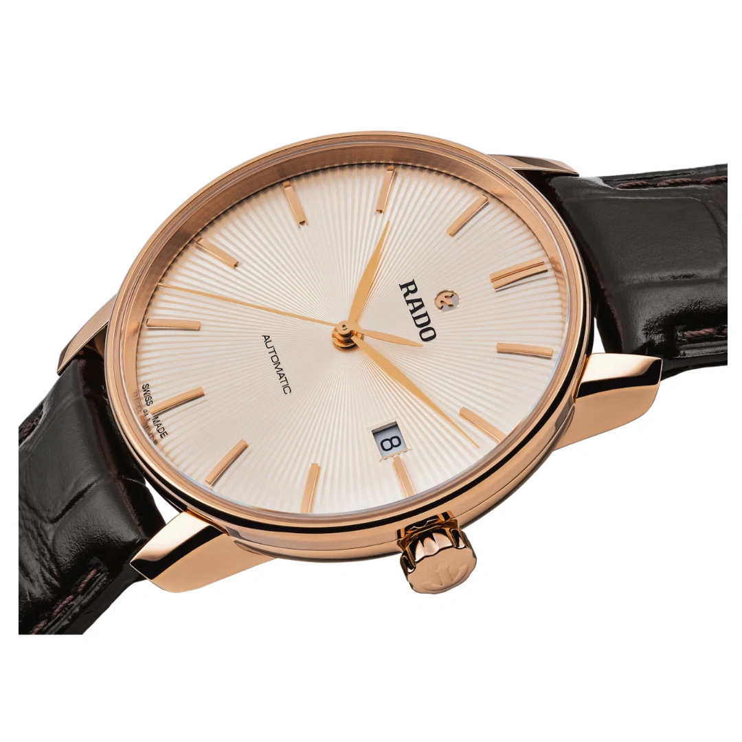 The Rado Coupole Automatic combines classic wristwatch design with modern sophistication. Its 37.7 mm stainless steel case is paired with a sapphire crystal, offering brilliant shine, exceptional clarity, and superior protection for the dial. The elegant dial, complemented by polished hands and applied indexes, ensures easy readability while maintaining a timeless aesthetic.