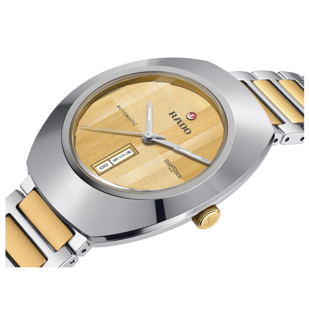 The Rado DiaStar Original Automatic is an iconic timepiece that blends distinctive design with Swiss precision. Its 38 mm stainless steel case, framed by a polished Ceramos™ coiffe, is paired with a parallel-stripe-faceted sapphire crystal for remarkable shine and clarity. The gold brushed dial, enhanced with rhodium-coloured hands and white Super-LumiNova®, offers excellent readability, while the white day-date display adds practical functionality. The two-direction brushed dial and polished accents make it a true statement piece on the wrist.