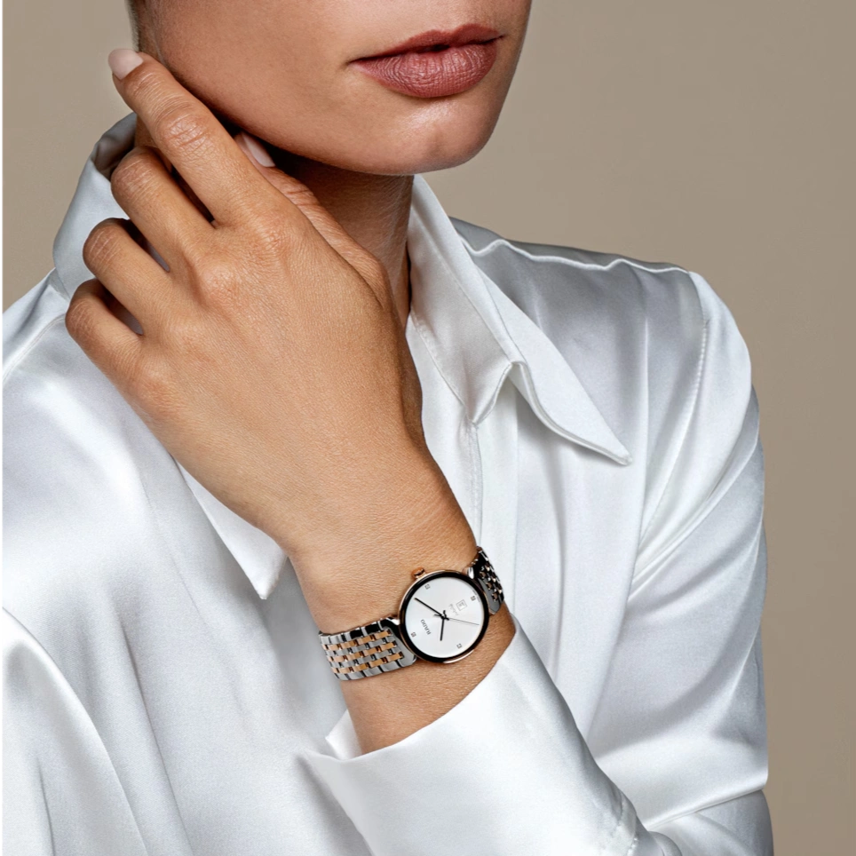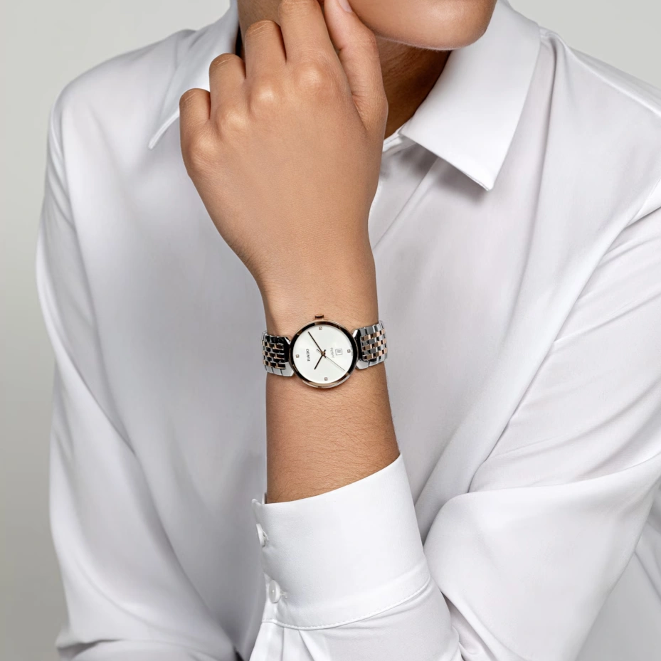 The Rado Florence Diamonds exudes elegance and sophistication inspired by the iconic architecture of Florence. Its 30 mm polished stainless steel case, complemented by a rose gold-coloured PVD-coated bezel, is topped with an edge-to-edge sapphire crystal featuring a rose gold metallised edge. The brown dial is enhanced with diamond-set and rose gold-coloured indexes, along with rose gold hands, creating a refined and sparkling aesthetic. A date guichet at 6 o’clock adds functional elegance, while the bi-tone bracelet of polished stainless steel and rose gold-coloured links completes the luxurious look.