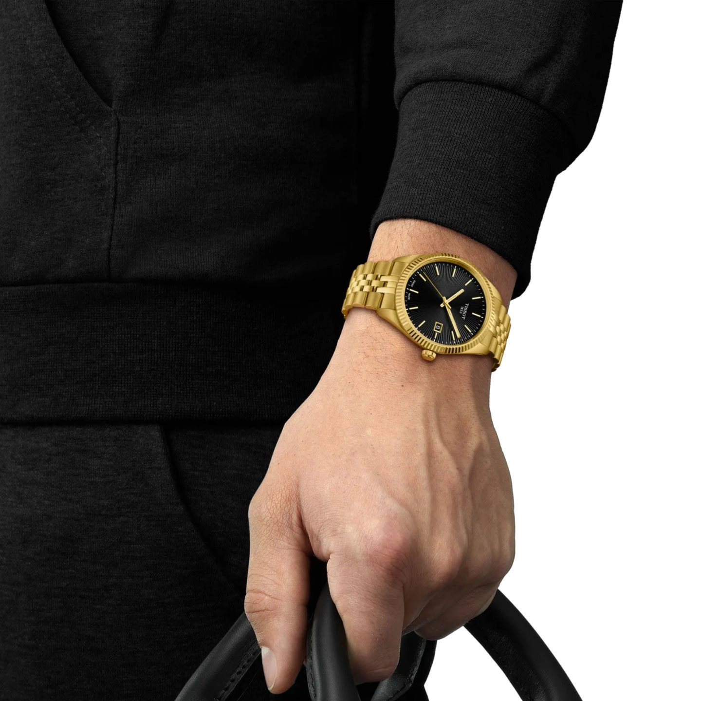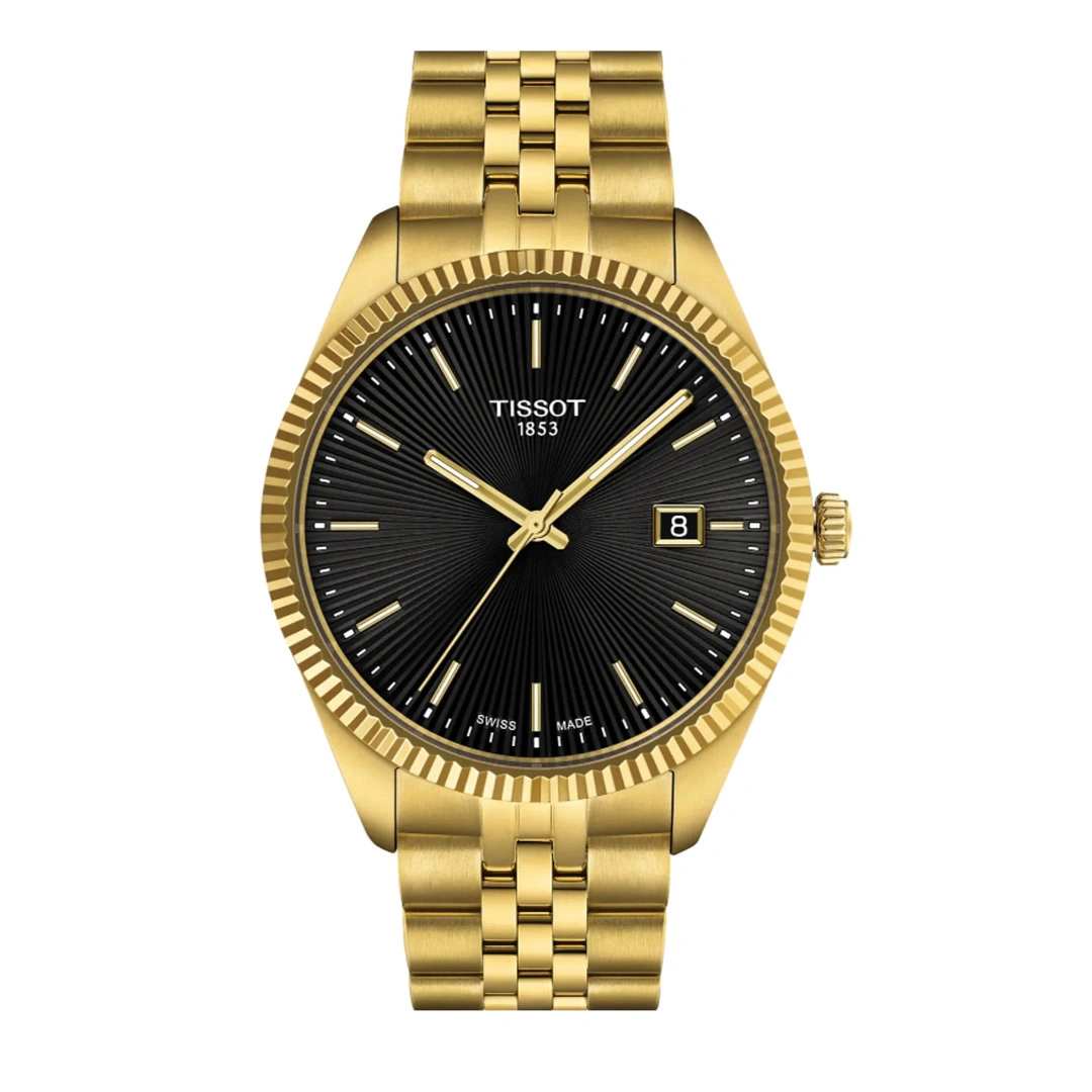 The Tissot Ballade 40mm embodies timeless elegance through refined Swiss craftsmanship and contemporary design. Its slim 316L stainless steel case, finished with rich yellow gold PVD coating, delivers a warm, luxurious presence on the wrist. The fluted bezel draws inspiration from traditional haute horlogerie, while the black guilloché dial with radiant sunbeam detailing adds depth, contrast, and visual sophistication.