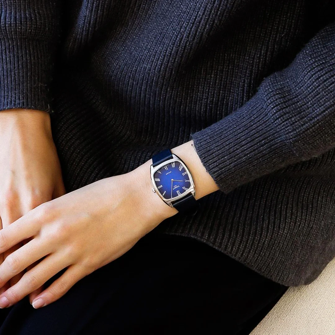 The Tissot Stylist 32x32mm combines modern design with timeless elegance, making it a versatile choice for both everyday wear and formal occasions. Its square 316L stainless steel case features a graded blue-black dial with Roman numerals and gold-toned hands, complemented by a sunburst finish that reflects light beautifully. The scratch-resistant sapphire crystal ensures durability, while the overall sleek silhouette adds sophistication to any outfit.